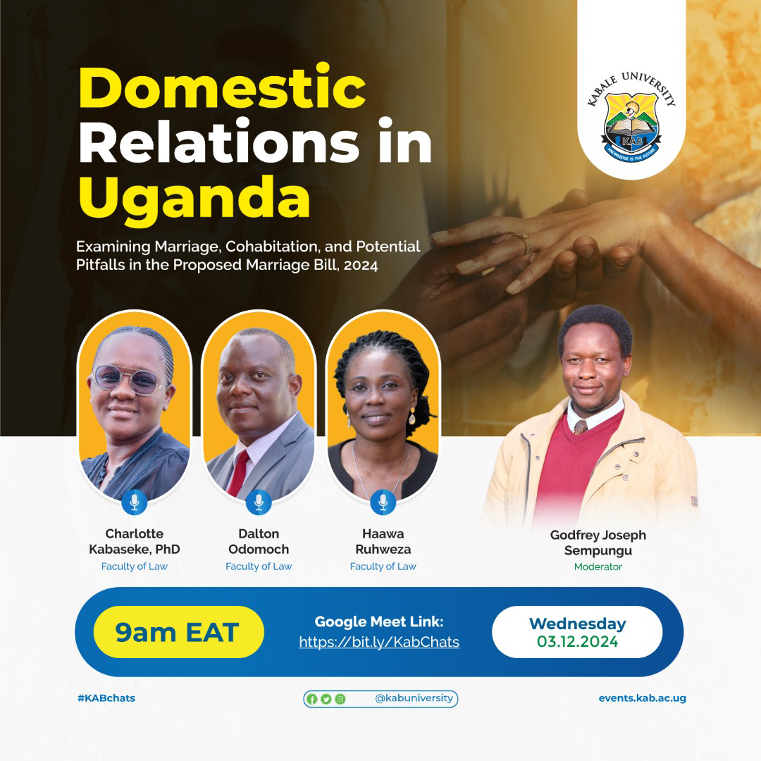 On December 4, 2024, Kabale University hosted the 14th episode of KAB Chats, focusing on the intricate topic of Domestic Relations in Uganda. The session, organized by the Communication, Branding and Marketing Department in collaboration with the Faculty of Law, provided an in-depth discussion on marriage, cohabitation and the proposed Marriage Bill, 2024.